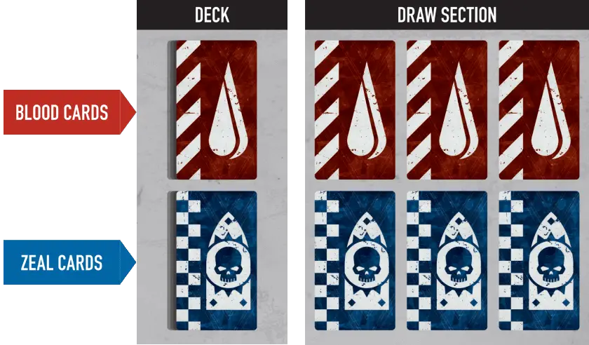When setting up the battle, separate the cards into two decks (one deck of Blood cards, one deck of Zeal cards), shuffle each deck, then place them face down next to the killzone. Place three cards from each deck face down next to their respective decks: this is the draw section (see example below). Whilst a card’s type (Blood or Zeal) is obvious, it’s important to keep its details secret – neither player can look at the text on these cards unless otherwise specified.