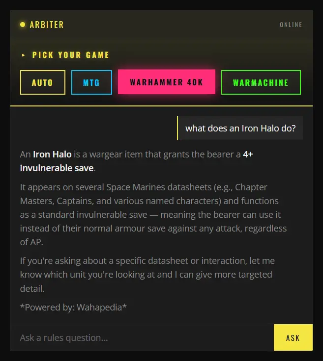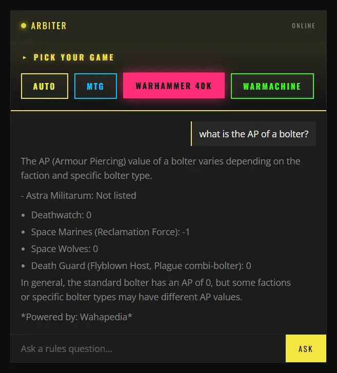 Warhammer 40k, Arbiter draws on official 10th Edition rules, faction packs, balance dataslates, and Wahapedia data to answer questions about core mechanics, datasheets, stratagems, detachment rules, and more. It also supports