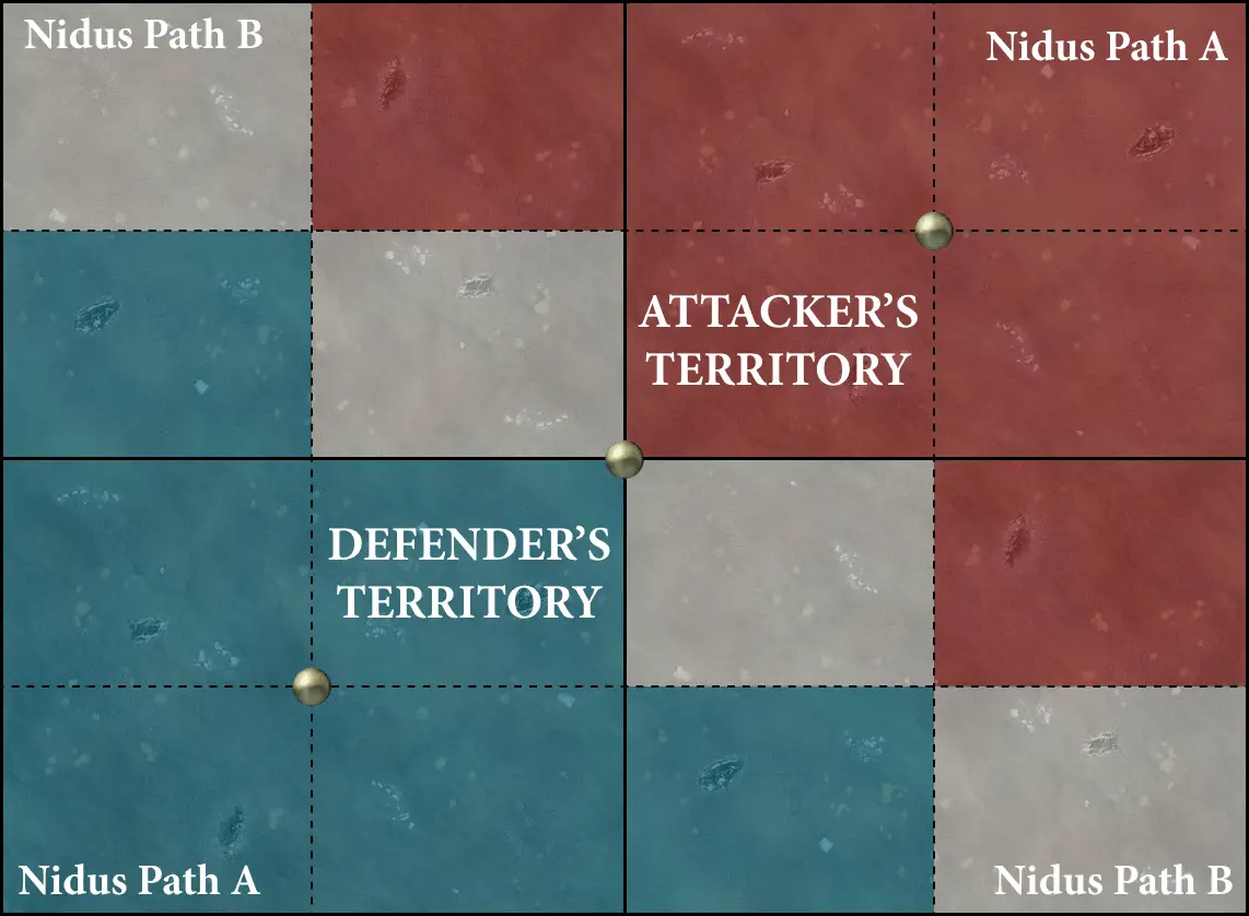 There are 4 Nidus Paths on this battleplan, each located in a corner of the battlefield. Each Nidus Path is linked to the Nidus Path in the diagonally opposite corner of the battlefield, i.e. both Nidus Path A’s are linked and both Nidus Path B’s are linked.