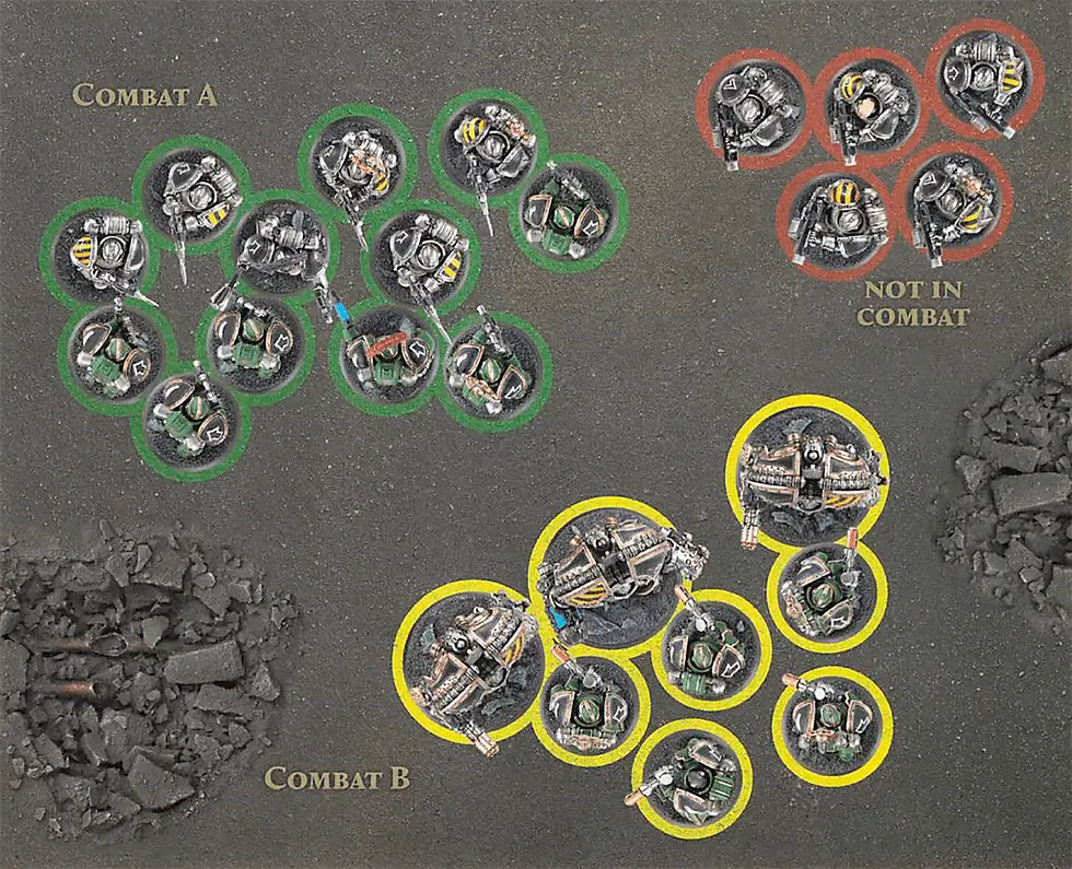 In the example pictured above the Unit marked in green has beaten the Unit marked in yellow. The yellow marked Unit has Fallen Back, while the green marked Unit will Pursue. The red marked Unit was not a part of the Combat. All Models in the green marked Unit must move directly towards Models in the yellow marked Unit when making their Pursue Move and cannot move towards Models in the red Marked Unit even though it is closer.The End Phase