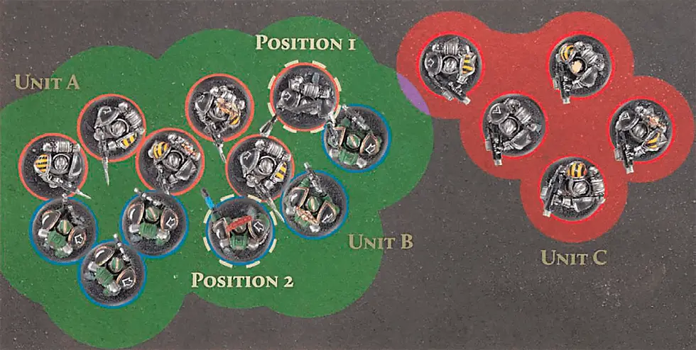 In the example pictured above the Unit marked in green has beaten the Unit marked in yellow. The yellow marked Unit has Fallen Back, while the green marked Unit will Pursue. The red marked Unit was not a part of the Combat. All Models in the green marked Unit must move directly towards Models in the yellow marked Unit when making their Pursue Move and cannot move towards Models in the red Marked Unit even though it is closer.The End Phase