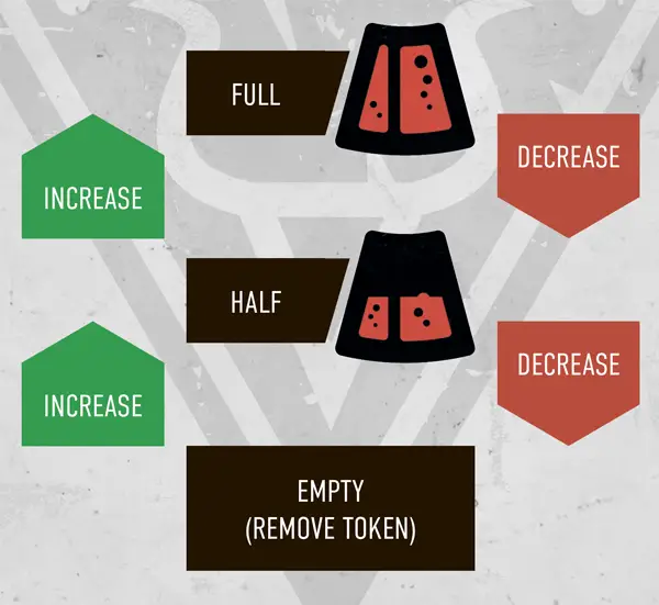 Each friendly GOREMONGER operative has a GORE TANK that has three levels: full, half and empty. They start the battle at half. Whenever a GORE TANK increases, it goes up one level; whenever it decreases, it goes down one level. A GORE TANK cannot increase when it’s already full, or decrease when it’s already empty (see diagram on other side).