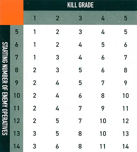 - If neither of these are true, work out your kill grade by adding up the number of enemy operatives that are incapacitated and consulting the table below (the row you use is determined by the starting number of enemy operatives). The player with the higher kill grade is the winner. If the players are tied, it’s a draw.