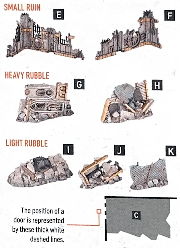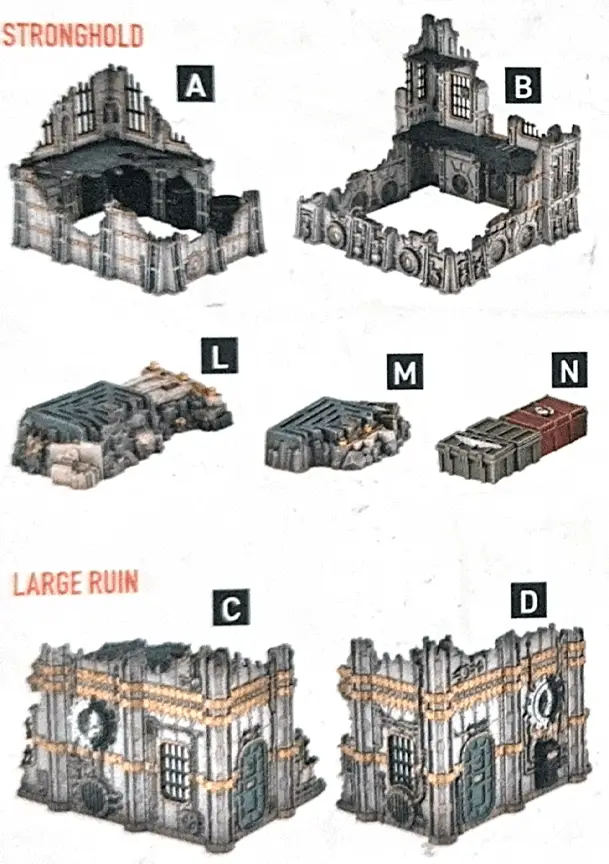 Killzone: Volkus below. Killzone: Volkus has 2x strongholds, 2x large ruins, 2x small ruins, 2x heavy rubble and 3x light rubble; their rules can be found