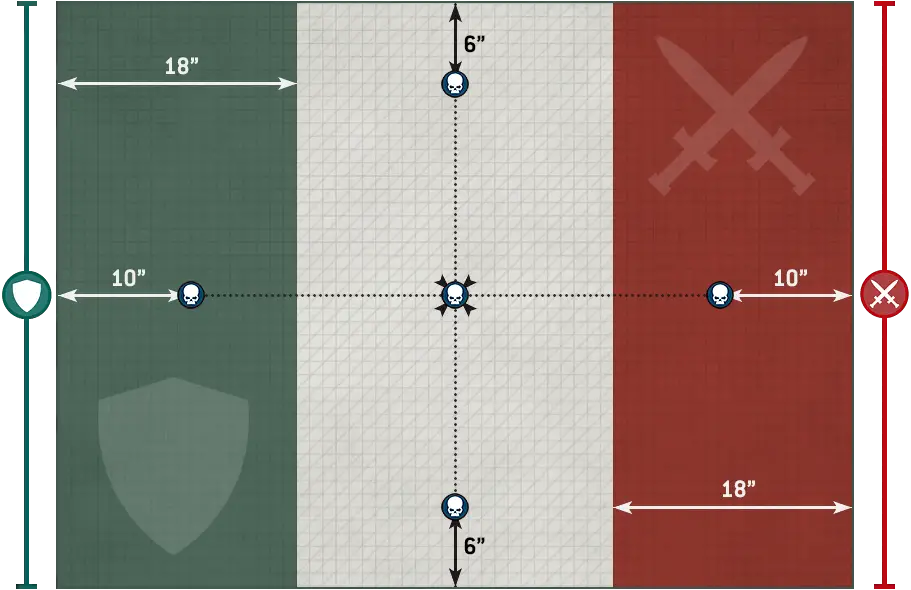Create the battlefield and set up terrain features (see the Core Rules). Missions are played on rectangular battlefields 44" by 60" in size. Terrain features should not be set up within any impassable sections (such as the walls of a ruin) within 1" of any objectivemarkers.